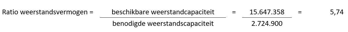 Op basis van de berekeningen is onze weerstandsratio 5,74. Ons weerstandsvermogen is dus voldoende. Dit betekent dat de beschikbare weerstandscapaciteit toereikend is om de gekwantificeerde risico’s per 31 december 2024 af te dekken.